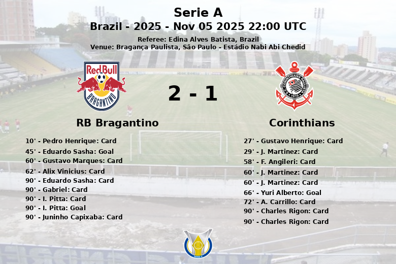 Dans le temps additionnel, alors qu’il semblait que le match nul était définitif, I. Pitta a marqué un but pour RB Bragantino à la 90e minute, assisté par Jhon Jhon. Charles Rigon de Corinthians a été expulsé à la 90e. Le match s’est terminé par un match nul. Le match a laissé un total de 13 cartons jaunes et 2 cartons rouges.