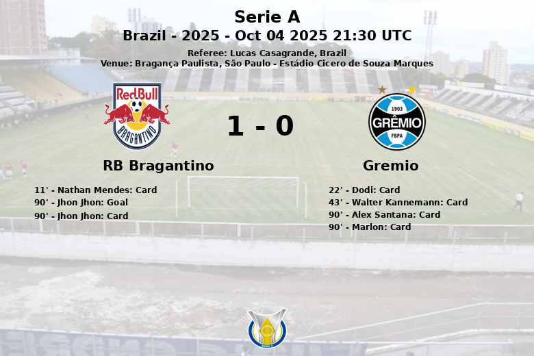 RB Bragantino a remporté la victoire à domicile contre Gremio dans un match chargé de tension et de polémiques, disputé à l’Estádio Cicero de Souza Marques. Avec une possession de balle de 58%, l’équipe locale a dominé une grande partie du jeu, générant un total de 27 tirs, bien que seulement 6 d’entre eux aient trouvé le cadre. Gremio, de son côté, a été pénalisé par l’expulsion de Walter Kannemann juste avant la mi-temps, obligeant l’équipe à jouer à dix pendant toute la seconde période. Malgré cela, l’équipe visiteuse a tenté de résister, mais n’a réussi qu’un seul tir cadré sur ses 5 tentatives. Le match, arbitré par Lucas Casagrande, a été marqué par un nombre élevé d’avertissements, avec quatre cartons jaunes pour Gremio et un pour Bragantino. L’action décisive est survenue dans le temps additionnel, lorsque Jhon Jhon a transformé un penalty en but, donnant la victoire à RB Bragantino. Le match s’est terminé avec le score en faveur de l’équipe locale, reflétant sa plus grande ambition offensive et sa maîtrise du ballon tout au long du match. Ce match correspondait à la 27e journée de la Série A du football brésilien, saison 2025. Le seul but a été marqué à la 90e minute.