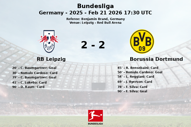 Le RB Leipzig a ouvert le score à la 20e minute grâce à un but de C. Baumgartner, sur une passe décisive de Y. Diomande. Baumgartner a de nouveau brillé à la 39e minute, en augmentant l’avance avec un autre but, cette fois sur une passe décisive de D. Raum. Cependant, la première mi-temps a également vu Rómulo Cardoso recevoir un carton jaune à la 30e minute, suivi de C. Lukeba à la 41e minute. Bensebaini de Dortmund a reçu un carton jaune juste avant la mi-temps.