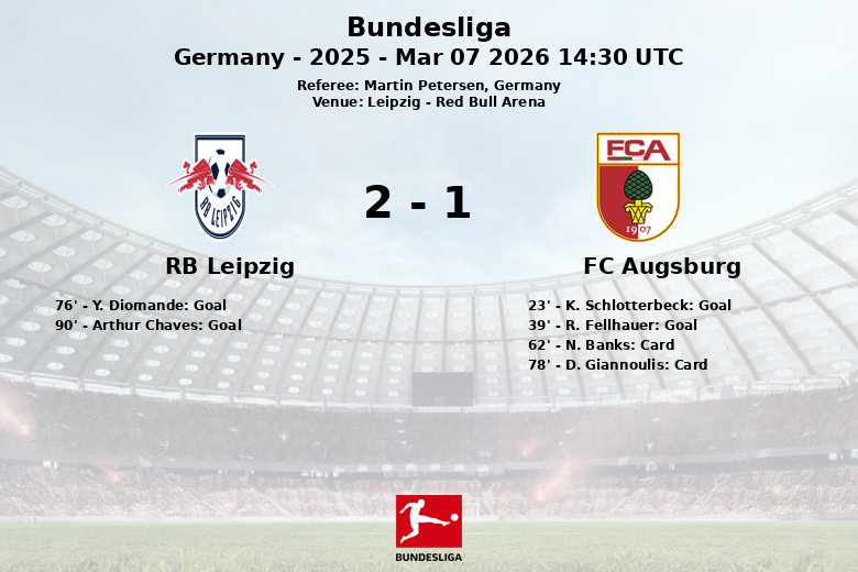 En seconde période, Leipzig a intensifié sa pression. Y. Diomande a réduit l’écart à la 76e minute, assisté par C. Harder, donnant de l’espoir à l’équipe locale. Alors qu’il semblait qu’Augsbourg allait remporter la victoire, un but contre son camp d’Arthur Chaves à la 90e minute a égalisé le score.