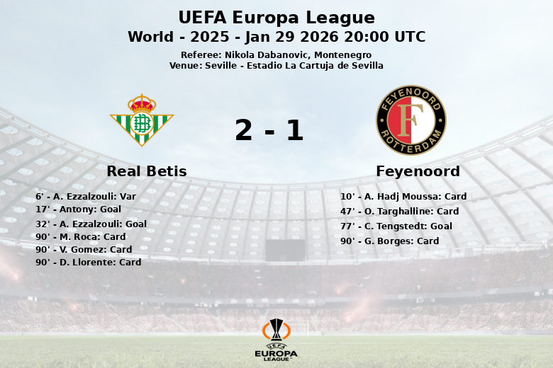 Séville, le 29 janvier 2026 – Le Real Betis s’est imposé avec autorité face au Feyenoord lors d’un match de l’UEFA Europa League disputé à l’Estadio La Cartuja de Séville. La rencontre, arbitrée par le Monténégrin Nikola Dabanovic, a été largement dominée par l’équipe locale, qui a contrôlé 62% de la possession du ballon.