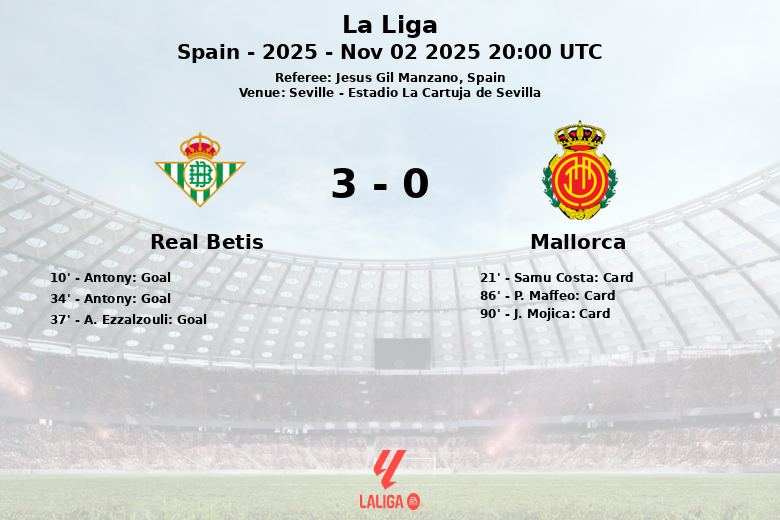 Majorque, bien qu’ayant 48 % de possession et le même nombre de tirs que le Betis, n’a réussi à en cadrer qu’un seul. L’équipe visiteuse a eu du mal face à l’intensité du jeu et a écopé de deux cartons jaunes, pour Samu Costa à la 21e minute et pour P. Maffeo à la 86e. De plus, J. Mojica a reçu un carton jaune à la 90e minute. Le Real Betis a commis 9 fautes, contre 7 pour Majorque, mais n’a reçu aucun carton jaune. Le match, disputé à l’Estadio La Cartuja de Séville et arbitré par Jesús Gil Manzano, a clairement montré la domination du Real Betis lors de la 11e journée de Liga.