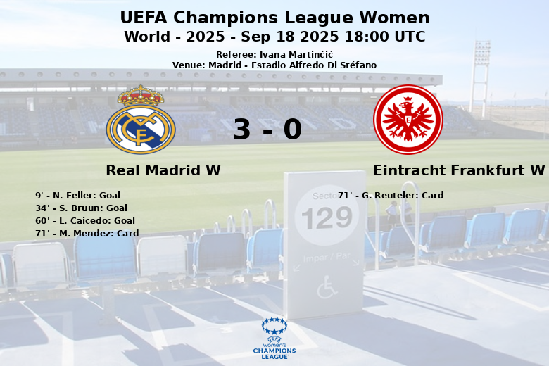 En seconde période, L. Caicedo est devenue la protagoniste absolue en marquant le troisième but à la 60e minute, consolidant la victoire du Real Madrid. Le match, arbitré par Ivana Martinčić, a vu un échange de cartons jaunes à la 71e minute, G. Reuteler de l’Eintracht Francfort et M. Mendez du Real Madrid étant averties. Malgré les avertissements et la domination merengue, l’Eintracht Francfort n’a pas pu répondre à l’offensive du Real Madrid.