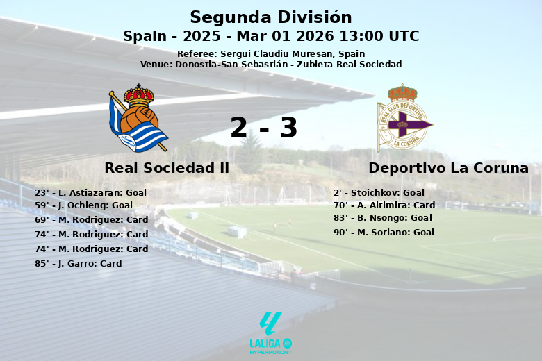 Bien que la Real Sociedad II ait conservé 44% de la possession et ait effectué 14 tirs, le Deportivo, avec 56% de la possession et 11 tirs, a été plus efficace devant le but. Le match s’est terminé avec le Deportivo La Coruña célébrant une précieuse victoire dans sa lutte pour la montée.