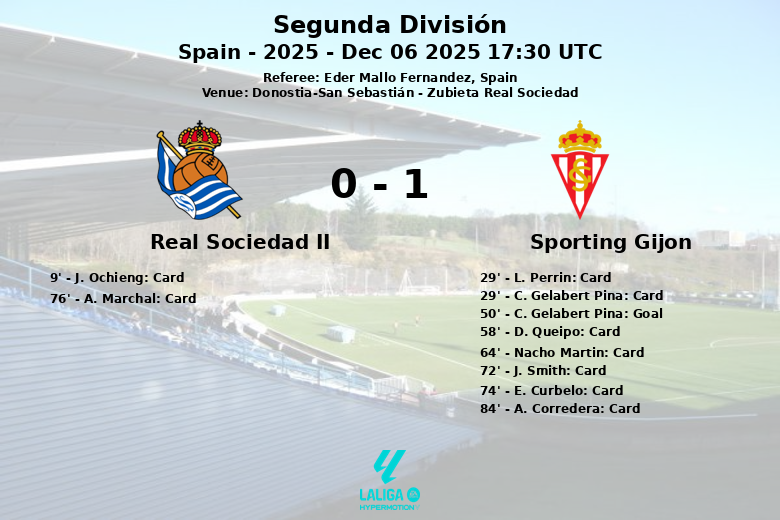 L’unique but du match a été marqué à la 50e minute par C. Gelabert Pina, sur une passe de D. Sanchez, donnant ainsi l’avantage décisif au Sporting Gijón. Bien qu’ayant dominé la possession de balle avec 58% contre 42% pour le Sporting, la Real Sociedad II n’a pas réussi à concrétiser ses occasions de but, ne cadrant qu’un seul tir sur sept tentatives.
