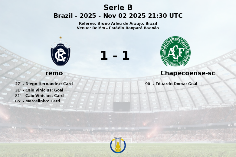Dans un match correspondant à la 35e journée de Serie B, Remo et Chapecoense-SC ont fait match nul au Estádio Banpará Baenão à Belém. Le match, arbitré par Bruno Arleu de Araujo, a été serré dès le début, avec un léger avantage en possession pour Chapecoense-SC (51%) contre 49% pour Remo.