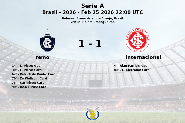 Un match passionnant au Mangueirão de Belém s’est terminé par un match nul, Internacional et Remo étant à égalité dans un match disputé du début à la fin. Internacional a pris une avance rapide à la 4e minute, grâce à un but d’Alan Patrick sur une passe décisive de Vitinho. Cependant, Remo a réagi rapidement et, à la 14e minute, L. Picco, assisté par Alef Manga, a égalisé.