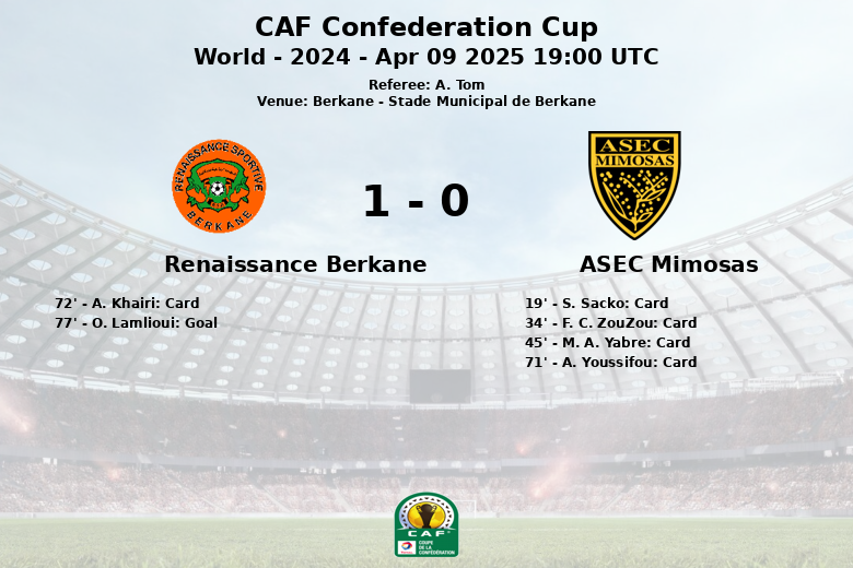 Le Renaissance Berkane a battu l’ASEC Mimosas sur le score serré de 1-0 en quarts de finale de la Coupe de la Confédération CAF, disputé au Stade Municipal de Berkane le 9 avril 2025. Le match, arbitré par A. Tom, a été marqué par la supériorité de possession de l’équipe locale (59 %), qui a généré plus d’occasions de but (11 tirs, 3 cadrés). Malgré cette domination en possession et en tirs, Berkane n’a réussi qu’un seul but, inscrit par O. Lamlioui à la 77e minute sur une passe de P. Bassene. L’ASEC Mimosas, avec 41 % de possession et 6 tirs, a montré du caractère mais n’a pas pu percer la défense adverse. La discipline a été un problème pour l’équipe visiteuse, accumulant 4 cartons jaunes (Sacko, ZouZou, Yabre et Youssifou), tandis que Berkane n’en a reçu qu’un seul. Malgré un plus grand nombre de fautes commises par l’ASEC Mimosas (14 contre 10), ils n’ont pas pu éviter la défaite face à un Berkane plus efficace.