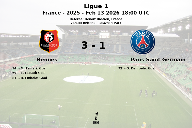 Rennes a ouvert le score à la 34e minute grâce à un but de M. Tamari. En seconde période, E. Lepaul a creusé l’écart à la 69e minute, assisté par S. Szymanski. Le PSG a rapidement réagi avec un but d’O. Dembele à la 72e minute, mais cette réaction fut de courte durée. À la 81e minute, B. Embolo a scellé la victoire avec le troisième but de Rennes, suite à une passe décisive de L. Blas.