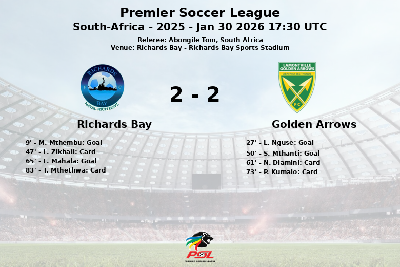 Richards Bay n’a pas abandonné et a réussi à égaliser à la 65e minute, avec un but de L. Mahala, assisté par M. Mthembu. Le match a été marqué par son intensité, reflétée par les cartons jaunes distribués à L. Zikhali et T. Mthethwa pour Richards Bay, et à N. Dlamini et P. Kumalo pour Golden Arrows.
