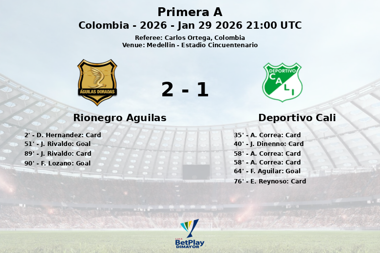 Medellín, Colombie – Un match riche en émotions et en rebondissements s’est conclu par une victoire 2-1 de Rionegro Águilas sur le Deportivo Cali à l’Estadio Cincuentenario. La rencontre, comptant pour la troisième journée de la Primera A colombienne, a été marquée par l’intensité et la discipline, reflétées par le nombre de cartons distribués par l’arbitre Carlos Ortega.