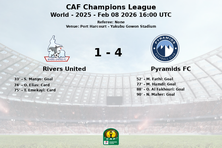 Le match a commencé avec Rivers United prenant l’avantage grâce à un but de S. Manyo à la 33e minute, sur une passe décisive de O. Duke. Cependant, Pyramids FC a réagi en seconde période. M. Fathi a égalisé à la 52e minute, sur une passe décisive de M. Ziko. La balance a penché en faveur de l’équipe visiteuse lorsque M. Hamdi a transformé un penalty à la 77e minute. Dans les dernières minutes, O. Al Fakhouri (88e) et N. Maher (90e) ont creusé l’écart pour Pyramids FC, scellant ainsi la victoire.