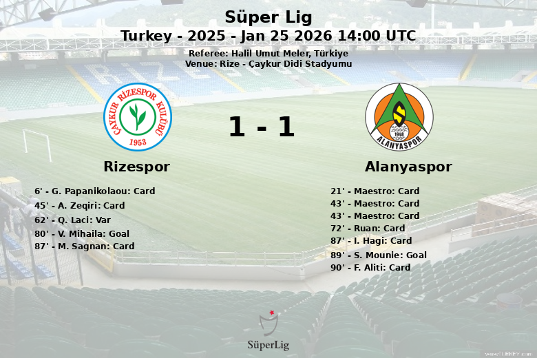 Remplacements dans l’quipe de rizespor: À la 62e minute, L. Augusto est entré et V. Mihaila est sorti., À la 72e minute, A. Zeqiri est entré et M. Pala est sorti., À la 85e minute, I. Olawoyin est entré et T. Antalyali est sorti., À la 85e minute, A. Sowe est entré et H. Dervisoglu est sorti.