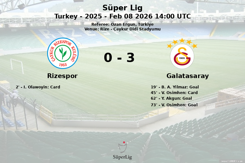 Malgré un carton jaune précoce pour I. Olawoyin de Rizespor à la 2e minute, Galatasaray a pris l’initiative et a ouvert le score à la 19e minute grâce à un but de B. A. Yilmaz, servi par N. Lang. Avant la mi-temps, V. Osimhen de Galatasaray a également reçu un carton jaune.