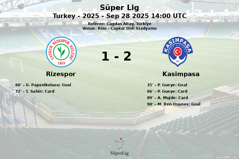 Rize, Turquie – Dans un match disputé au Çaykur Didi Stadyumu, Rizespor et Kasimpasa se sont quittés sur un match nul dans une rencontre pleine de rebondissements. Kasimpasa a pris l’avantage à la 35e minute avec un but de P. Gueye, servi par M. Ben Ouanes. Rizespor a réagi en seconde période, avec un but de G. Papanikolaou à la 60e minute, assisté par E. Bulut. Alors que le match nul semblait acquis, M. Ben Ouanes a marqué pour Kasimpasa à la 90e minute, sur une passe de A. Mujde, scellant le score final.