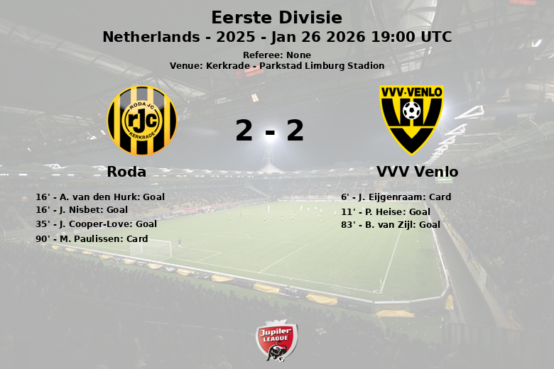 VVV Venlo a pris l’avantage dès la 11e minute avec un penalty transformé par P. Heise, suite à un carton jaune pour J. Eijgenraam à la 6e minute. Cependant, Roda a répondu avec force. A. van den Hurk a manqué un penalty à la 16e minute, mais la chance a rapidement souri à Roda, puisque J. Nisbet a égalisé le score à la même minute avec un but. La remontée de Roda s’est achevée avec un but de J. Cooper-Love à la 35e minute, sur une passe de J. Kruiver.