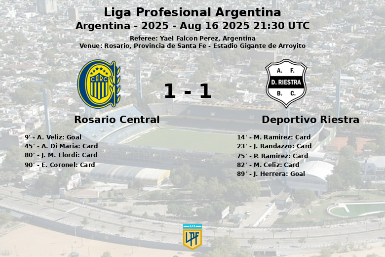 Rosario, province de Santa Fe – Lors d’un match acharné au stade Gigante de Arroyito, Rosario Central a fait match nul avec Deportivo Riestra sur le score de un à un dans la Liga Profesional Argentina. Le match, correspondant à la 5e journée de la deuxième phase de la saison 2025, a été marqué par l’intensité et un nombre élevé de fautes.