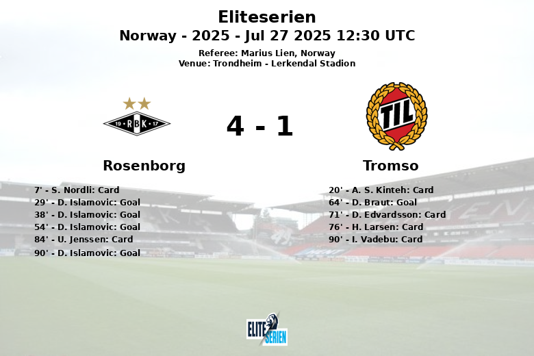 Le match a commencé à un rythme intense, comme en témoigne un carton jaune précoce pour S. Nordli de Rosenborg à la 7e minute, et peu après pour A. S. Kinteh de Tromsø à la 20e. Islamovic a ouvert le score à la 29e minute grâce à une passe décisive de E. K. Ceide. Islamovic lui-même a étendu l’avance à la 38e minute sur penalty, emmenant Rosenborg à la mi-temps avec un avantage confortable.