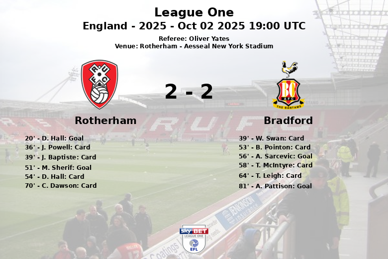 Rotherham a pris l’avantage tôt dans le match avec un but de D. Hall à la 20e minute, sur une passe de J. Benson. Les « Millers » ont creusé l’écart en début de seconde période grâce à M. Sherif, qui a profité d’une passe décisive de R. James pour porter le score à 2-0. Cependant, Bradford a démontré sa capacité à revenir dans le match, en commençant par un but de A. Sarcevic à la 56e minute, sur une passe de J. Neufville. La pression de Bradford a continué, et A. Pattison a marqué le but égalisateur à la 81e minute, sur une passe de A. Cook, scellant ainsi le résultat final.