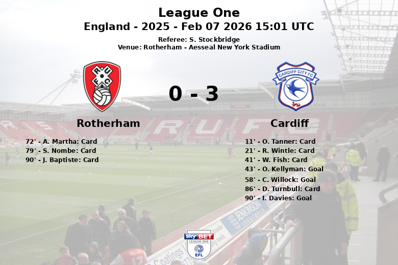 La deuxième mi-temps a vu Cardiff accroître son avance grâce à C. Willock, de nouveau assisté par Tanner, à la 58e minute. Rotherham a tenté de réagir, mais la défense de Cardiff est restée solide. Dans les dernières minutes, I. Davies a scellé le match avec un but à la 90e minute, assisté par D. Turnbull, assurant une victoire importante à son équipe. Le match s’est terminé avec un total de six cartons jaunes et un carton rouge, reflétant l’intensité de la rencontre. Rotherham a eu plus de possession (51%) et 9 tirs, tandis que Cardiff a profité de ses occasions avec 15 tirs.