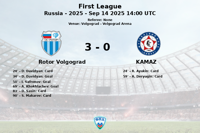 En deuxième mi-temps, le Rotor Volgograd a continué sa domination. I. Safronov a étendu l’avance à la 50e minute avec un but qui a consolidé le contrôle du match. Le KAMAZ, pour sa part, a tenté de réagir, mais s’est heurté à une défense solide et bien organisée. A. Deryugin du KAMAZ a reçu un carton jaune à la 59e minute. Le coup de grâce est arrivé à la 69e minute, lorsque A. Khokhlachev a marqué le troisième but pour le Rotor Volgograd, scellant le match. Dans les dernières minutes, D. Sasin et S. Makarov du Rotor Volgograd ont été avertis de cartons jaunes.