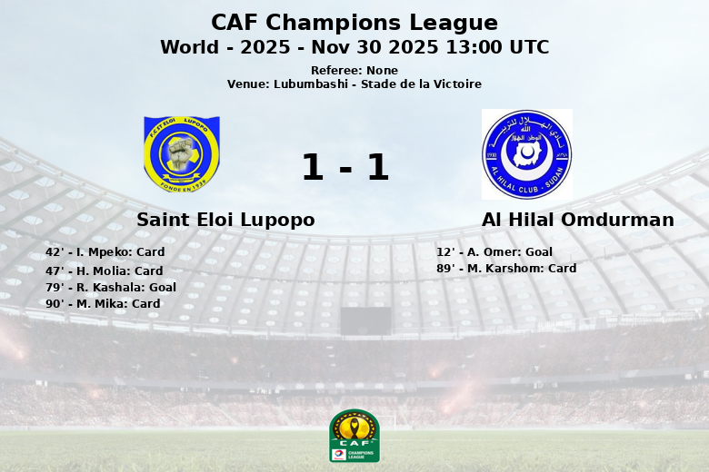 Le match a été intense et disputé, avec un total de 23 fautes commises par les deux équipes. L’arbitre a distribué trois cartons jaunes aux joueurs de Saint Eloi Lupopo (I. Mpeko, H. Molia et M. Mika) et un à un joueur d’Al Hilal Omdurman (M. Karshom). Malgré les efforts des deux équipes, le score n’a plus évolué, scellant un match nul qui laisse la qualification ouverte.
