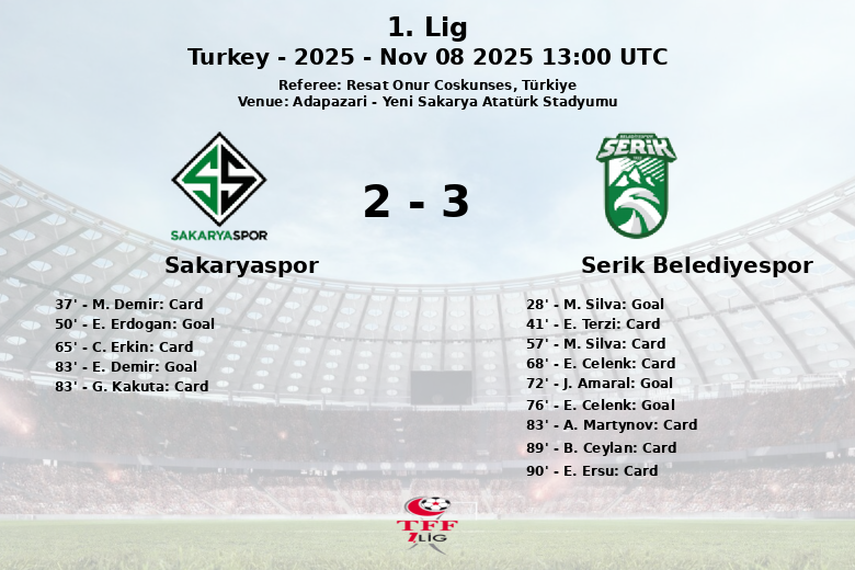 M. Silva a ouvert le score pour Serik Belediyespor à la 28e minute, grâce à une passe décisive de J. Amaral. Sakaryaspor a répondu en deuxième mi-temps, avec un but de E. Erdogan à la 50e minute, sur une passe de W. Ben Yedder, égalisant ainsi le score. L’intensité du match s’est reflétée dans les nombreux cartons jaunes distribués aux deux équipes.