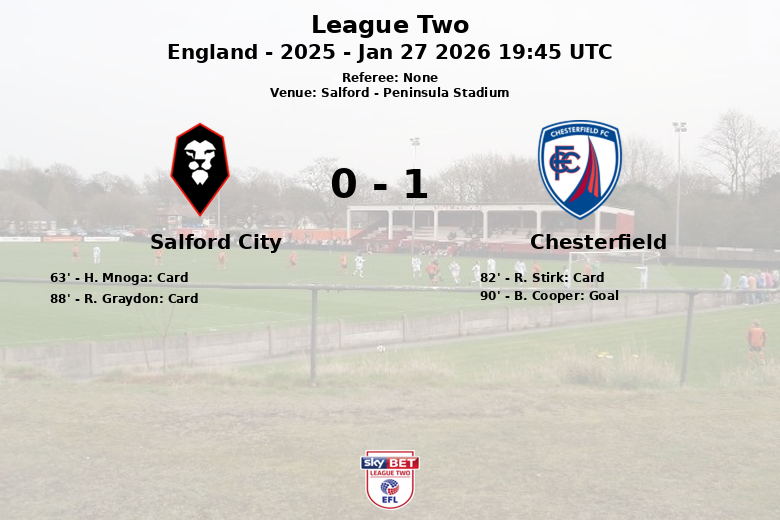 Salford, Angleterre – Dans un match disputé au Peninsula Stadium, Salford City a réussi à vaincre Chesterfield lors de la 29e journée de la League Two. Le match, joué dans une atmosphère tendue, s’est terminé par un résultat favorable à l’équipe locale grâce à un malheureux but contre son camp en fin de rencontre.