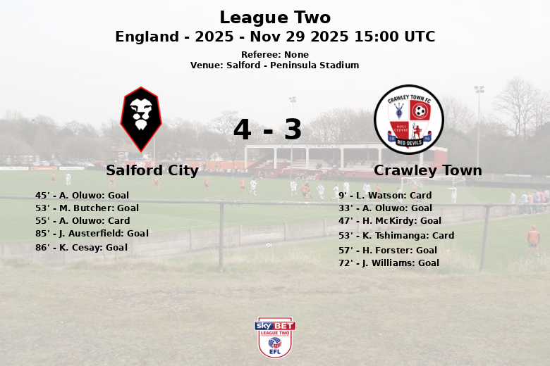 Crawley a repris l’avantage à la 72e minute grâce à un but de J. Williams, sur une passe décisive de J. Roles. Cependant, Salford City a refusé d’abandonner. J. Austerfield a égalisé à la 85e minute, et K. Cesay a scellé la victoire pour Salford à la 86e minute.
