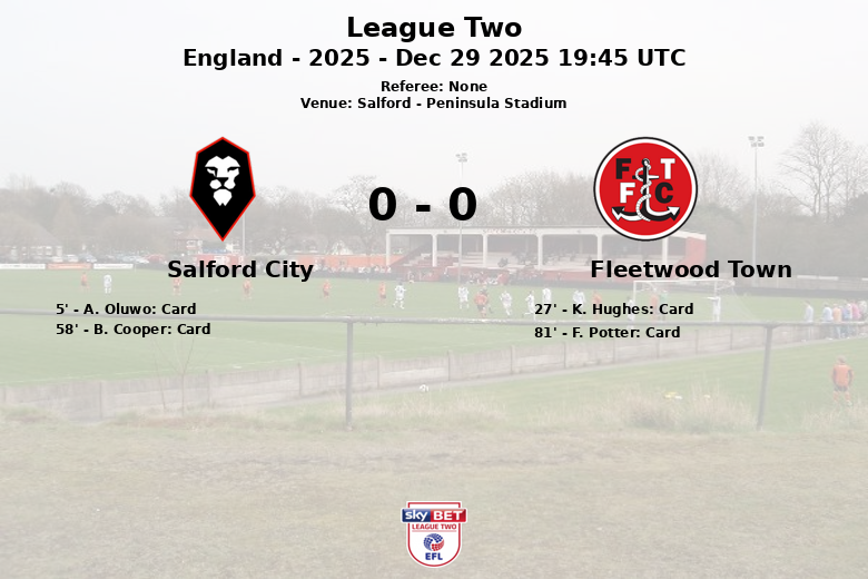 Salford City a tenté 16 tirs, dont seulement trois cadrés, tandis que Fleetwood Town a effectué 14 tirs, dont cinq dirigés vers le but adverse. La discipline a été un facteur clé, avec un total de quatre cartons jaunes distribués tout au long du match : deux pour Salford City (A. Oluwo et B. Cooper) et deux pour Fleetwood Town (K. Hughes et F. Potter). Malgré les efforts des deux équipes, le score est resté inchangé jusqu’au coup de sifflet final.
