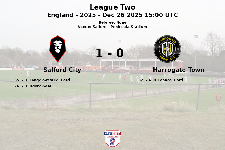 Le match, joué le 26 décembre 2025, a été marqué par l’intensité et les batailles au milieu de terrain. Harrogate Town a reçu un carton jaune à la 32e minute pour une faute de A. O’Connor. Salford City a répondu par un autre avertissement pour R. Longelo-Mbule à la 55e minute.