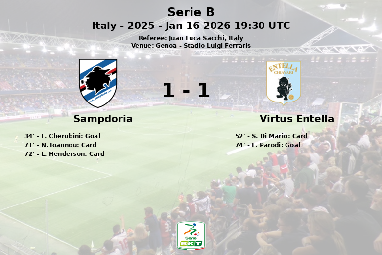 Concernant les statistiques du match, la Sampdoria a effectué 9 tirs, dont 3 cadrés et 1 non cadré, en plus d’obtenir 8 corners. De son côté, Virtus Entella a généré 7 tirs, dont 2 cadrés et 3 manqués, n’obtenant qu’1 corner. Le match a été marqué par un nombre élevé de fautes, avec 25 commises par la Sampdoria et 30 par Virtus Entella. L’arbitre, Juan Luca Sacchi, a montré 2 cartons jaunes aux joueurs de la Sampdoria et 1 à un joueur de Virtus Entella.