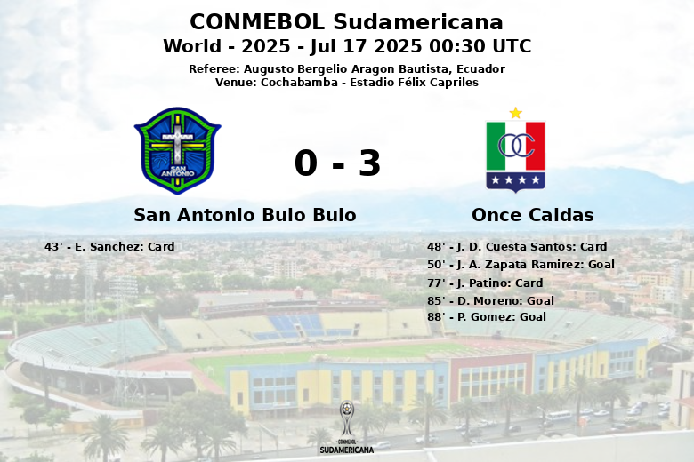 Cochabamba, Bolivie – Lors d’un match disputé à l’Estadio Félix Capriles, Once Caldas a remporté une victoire importante sur San Antonio Bulo Bulo, bien que le déroulement du match ait été marqué par l’expulsion de E. Sanchez à la 43e minute, laissant l’équipe locale à dix joueurs.