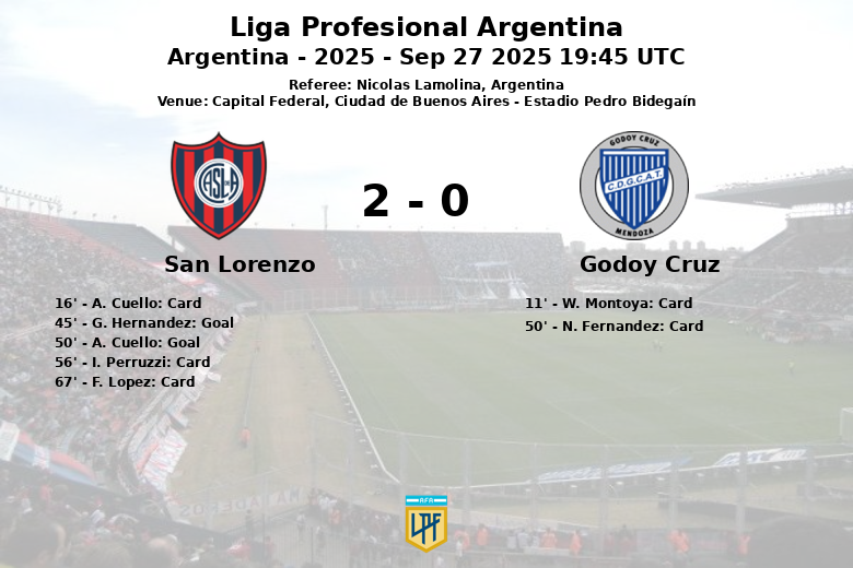 En seconde période, A. Cuello (50′) a accru l’avantage de San Lorenzo sur penalty. N. Fernandez (50′) de Godoy Cruz et I. Perruzzi (56′) de San Lorenzo ont également été avertis. Le jeu a continué à un rythme soutenu, comme en témoigne un nouveau carton jaune pour F. López (67′) de San Lorenzo.