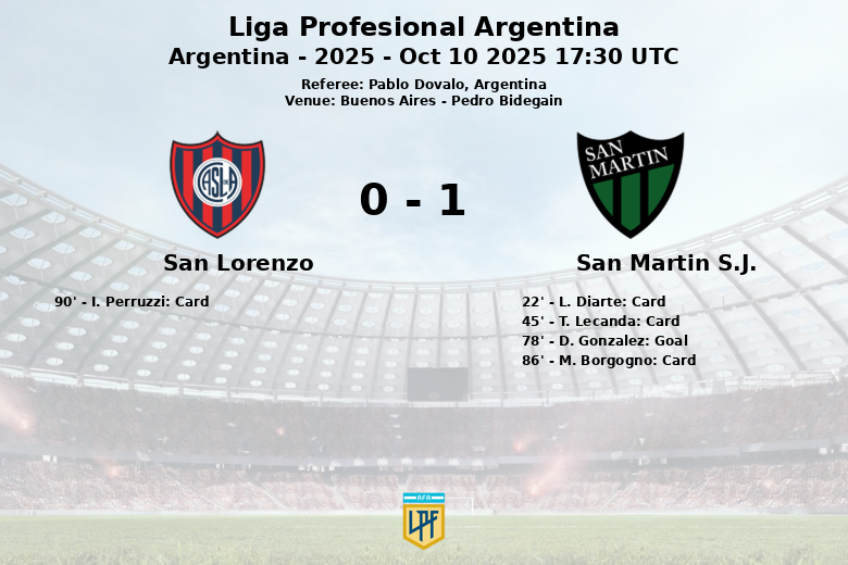 Le match a été physique, avec 13 fautes commises par San Martín, entraînant trois cartons jaunes pour L. Diarte, T. Lecanda et M. Borgogno. San Lorenzo a reçu un carton jaune pour I. Perruzzi. L’unique but du match est intervenu à la 78e minute, lorsque D. Gonzalez, servi par S. Jaurena, a concrétisé l’action offensive de l’équipe de San Juan. Malgré des efforts tardifs, San Lorenzo n’a pas pu inverser le score.