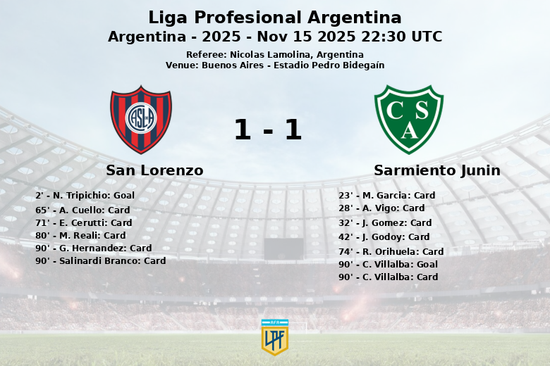 Buenos Aires, Argentine – Un match tendu et riche en cartons s’est déroulé à l’Estadio Pedro Bidegaín, où San Lorenzo et Sarmiento de Junín ont fait match nul. Le match, valable pour la 16e journée de la Liga Profesional Argentina, Saison 2025, s’est terminé sur un score qui reflète la lutte et la parité sur le terrain.