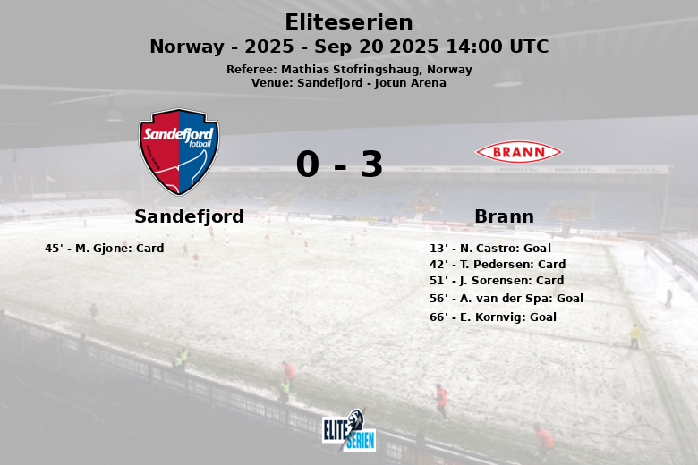 Brann a pris l’avantage dès la 13e minute grâce à un but sur penalty transformé par N. Castro. Cependant, le match s’est tendu avec un carton jaune pour T. Pedersen de Brann à la 42e minute et un carton rouge pour M. Gjone de Sandefjord juste avant la mi-temps, à la 45e minute, laissant l’équipe locale à dix.