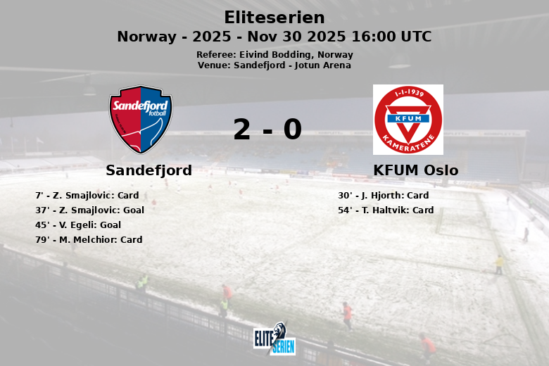 Sandefjord a remporté une victoire importante à domicile contre le KFUM Oslo lors d’un match disputé à la Jotun Arena. Malgré une possession de balle inférieure (39% contre 61% pour le KFUM Oslo), l’équipe locale a su saisir ses opportunités. Le match s’est échauffé tôt, avec un carton jaune pour Z. Smajlovic de Sandefjord à la 7e minute et pour J. Hjorth du KFUM Oslo à la 30e minute. Z. Smajlovic s’est racheté en marquant le premier but pour Sandefjord à la 37e minute, avec une passe décisive de E. Patoulidis. Avant la mi-temps, V. Egeli a creusé l’écart pour Sandefjord à la 45e minute. En deuxième mi-temps, le rythme du match est resté intense, avec un carton jaune pour T. Haltvik du KFUM Oslo à la 54e minute et un autre pour M. Melchior de Sandefjord à la 79e minute. Bien qu’ayant le même nombre de tirs (12), Sandefjord a été plus efficace devant le but. Le KFUM Oslo a obtenu plus de corners (12 contre 3 pour Sandefjord) mais n’a pas réussi à les convertir en buts. Le match s’est terminé avec Sandefjord célébrant une précieuse victoire à domicile.