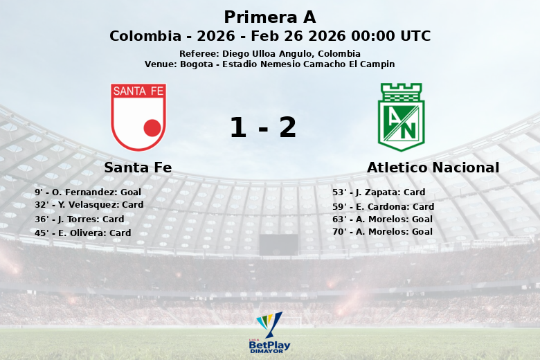 Santa Fe a pris l’avantage dès la 9e minute avec un but de O. Fernandez, sur une passe de E. Mosquera, déclenchant l’euphorie chez les supporters locaux. Cependant, la joie n’a pas duré longtemps, car le match est devenu disputé, avec plusieurs cartons jaunes montrés aux joueurs des deux équipes, notamment Y. Velasquez, J. Torres et E. Olivera pour Santa Fe, et J. Zapata et E. Cardona pour Atlético Nacional.