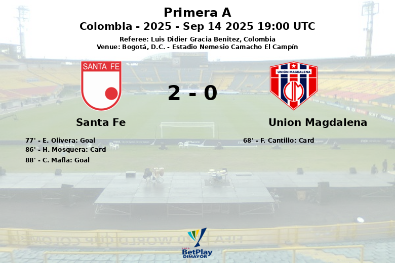 Remplacements dans l’quipe de santa fe: À la 62e minute, E. Perlaza est entré et E. Lopez est sorti., À la 62e minute, E. Murillo est entré et Y. Moreno est sorti., À la 81e minute, O. Fernandez est entré et A. Rodriguez est sorti., À la 90e minute, H. Rodallega est entré et A. Zapata est sorti., À la 90e minute, H. Mosquera est entré et M. Meli est sorti.