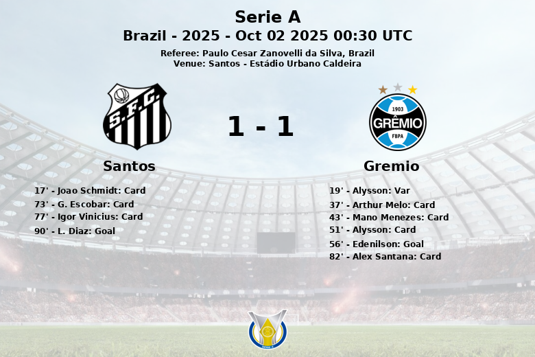 En seconde période, Gremio a réussi à ouvrir le score à la 56e minute grâce à un but d’Edenilson, servi par C. Pavón. Il semblait que l’équipe visiteuse allait remporter la victoire, malgré une possession de balle de seulement 36% et un faible nombre de tirs cadrés (un seul dans tout le match). Cependant, à la 90e minute, L. Diaz de Santos a réussi à égaliser, déclenchant l’euphorie parmi les supporters locaux. Santos, qui a effectué 22 tirs, dont seulement 7 cadrés, a finalement trouvé le chemin des filets. Le match s’est conclu par un match nul qui laisse un goût amer pour les deux équipes.