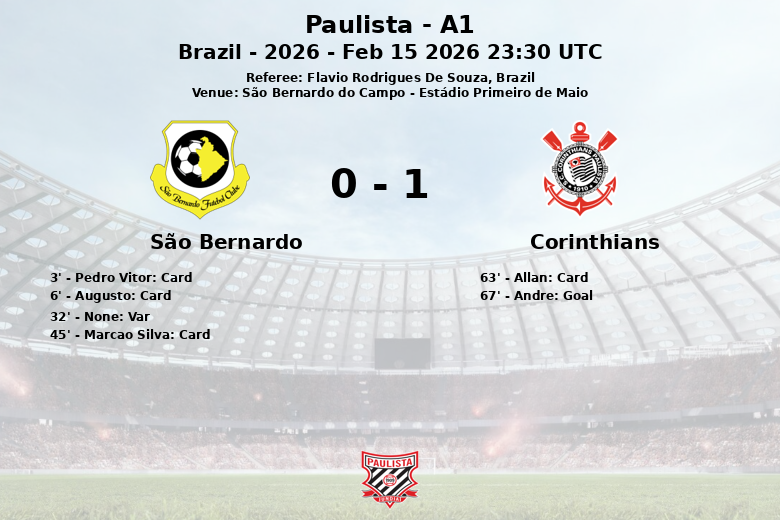 Remplacements dans l’quipe de são bernardo: À la 62e minute, Marcao Silva est entré et Junior Urso est sorti., À la 62e minute, Pedro Vitor est entré et Pablo Dyego est sorti., À la 71e minute, Augusto est entré et Lucas Rian est sorti., À la 78e minute, Romisson est entré et Rodrigo Andrade est sorti., À la 79e minute, Hugo Sanches est entré et Rodrigo Ferreira est sorti.