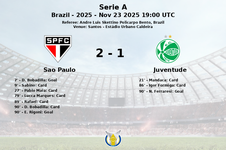 Le match a atteint son point culminant dans les dernières minutes. À la 90ème minute, E. Rigoni a élargi l’avance de Sao Paulo, semblant sceller la victoire. Cependant, l’excitation ne s’est pas arrêtée là, car un but contre son camp de N. Ferraresi également à la 90ème minute a donné à Juventude un dernier souffle, bien que cela n’ait pas suffi à changer le résultat final. Andre Luis Skettino Policarpo Bento était l’arbitre du match.