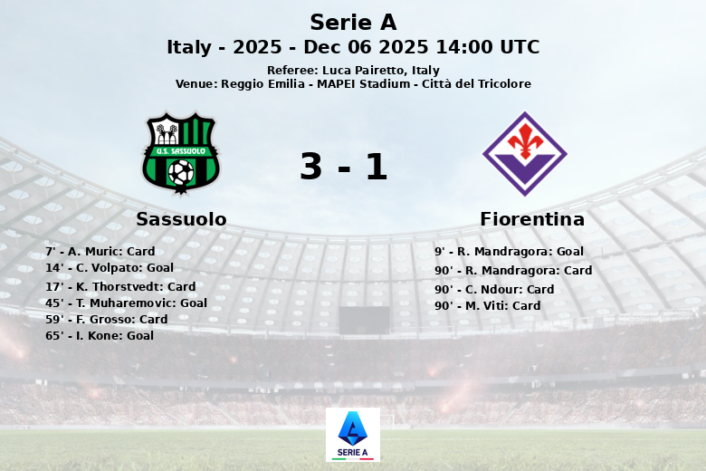 Le match a commencé sur un rythme effréné. La Fiorentina a pris l’avantage en début de match grâce à un penalty transformé par R. Mandragora à la 9e minute. Cependant, Sassuolo a rapidement réagi, d’abord avec un but de C. Volpato à la 14e minute, puis avec un autre but de T. Muharemovic juste avant la mi-temps, à la 45e minute, donnant l’avantage à l’équipe locale.