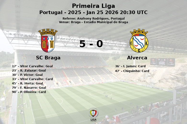 En seconde période, Braga a maintenu le contrôle, bien qu’Alverca ait tenté de réagir avec un jeu plus physique mis en évidence par les cartons. F. Navarro a scellé la victoire à la 79e minute, assurant une victoire convaincante pour Braga. Alverca, de son côté, a eu du mal à trouver des occasions, mais ses rares tentatives de tir n’ont pas inquiété le but local. L’arbitre Anzhony Rodrigues a averti deux joueurs d’Alverca (I. James et Chiquinho) et deux joueurs de Braga (Vitor Carvalho et P. Oliveira) lors d’un match marqué par la domination locale et la frustration des visiteurs.