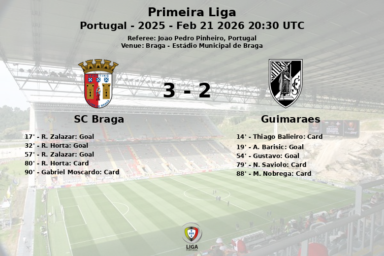 En seconde période, Guimaraes a montré des signes de reprise et Gustavo a réussi à marquer à la 54e minute, assisté par N. Saviolo, égalisant à nouveau le score. Mais le SC Braga n’était pas disposé à céder et, seulement trois minutes plus tard, R. Zalazar est réapparu au tableau d’affichage, marquant un but, assisté par R. Horta, qui leur donnerait finalement la victoire.