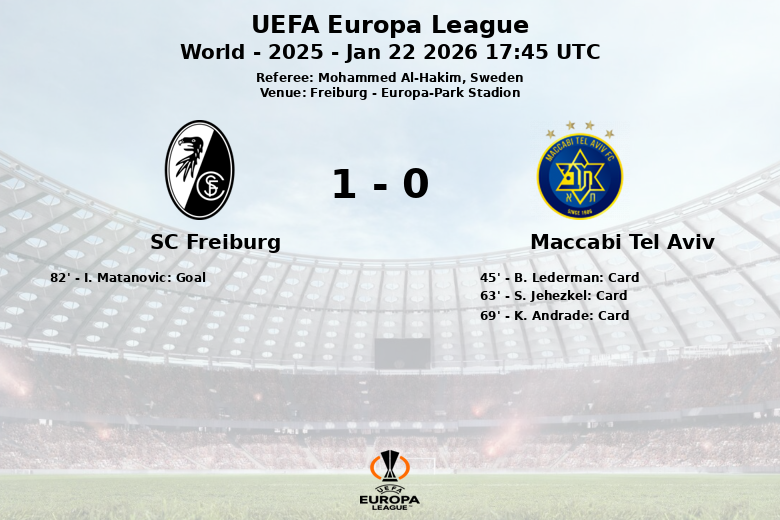 Le match a été marqué par une différence notable en matière de discipline. Le Maccabi Tel Aviv a écopé de 3 cartons jaunes (B. Lederman à la 45e minute, S. Jehezkel et K. Andrade aux 63e et 69e minutes respectivement), tandis que Fribourg a gardé son calme et n’a reçu aucun avertissement. Le match, arbitré par Mohammed Al-Hakim de Suède, s’est soldé par une victoire pour l’équipe locale lors de cette journée de la Ligue Europa de l’UEFA.