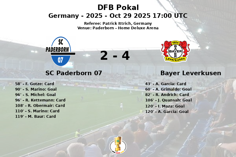 Dans le temps additionnel, S. Marino a marqué pour Paderborn à la 90e minute, suivi rapidement par S. Michel à la 96e minute, emmenant le match en prolongation de manière dramatique. Leverkusen a repris l’avantage en prolongation avec des buts de J. Quansah à la 106e minute, I. Maza à la 120e minute, et enfin, A. Garcia également à la 120e minute, assurant ainsi sa qualification pour le tour suivant.