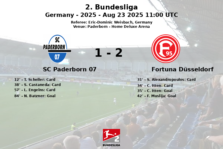 Le Fortuna Düsseldorf a contrôlé le match avec 57% de possession, générant 13 tirs, dont 6 cadrés. Le SC Paderborn 07, malgré son infériorité numérique, a réalisé 17 tirs, dont seulement 4 cadrés. L’arbitre Eric-Dominic Weisbach a montré deux cartons jaunes aux joueurs de Düsseldorf et deux aux joueurs de Paderborn, en plus du carton rouge direct à Scheller. Au final, le Fortuna Düsseldorf a remporté les trois points dans un match qui a fait couler beaucoup d’encre. Le match s’est joué le 23 août 2025.