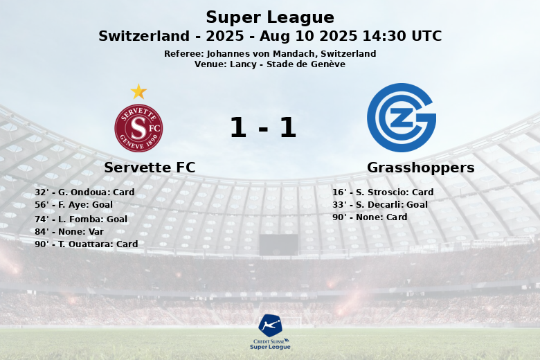 Grasshoppers a pris l’avantage à la 33e minute grâce à un but de la tête de S. Decarli, sur une passe décisive de L. Plange. Cependant, le Servette, avec une plus grande possession de balle (59%), n’a pas abandonné et a constamment cherché l’égalisation. Malgré un penalty manqué par F. Aye à la 56e minute, les locaux ont trouvé le chemin des filets à la 74e minute avec un but de L. Fomba, de nouveau servi par Aye.